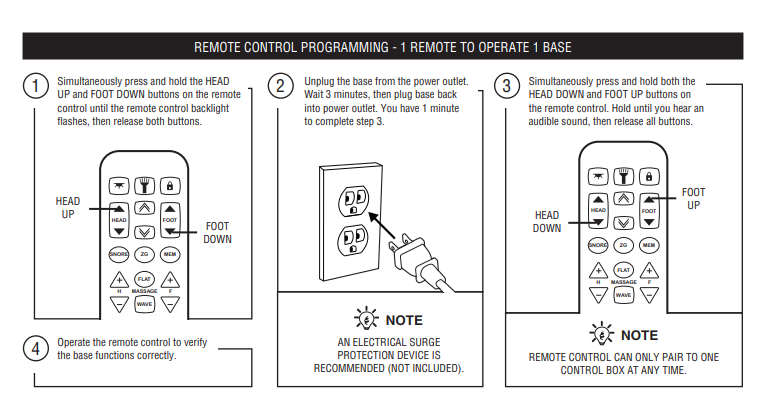 Reprogramming the remote control to the base is recommended for any adjustable base issue. The instructions can be seen in the images and video below.